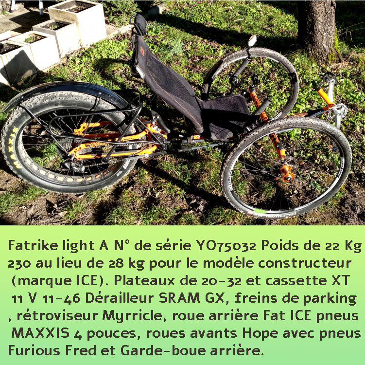 Fatrike entièrement modifié avec trois roues allégées à prix coûtant sacrifié de 3200 €Terrain VAE marque Trident, 1900 € au lieu de 2600 €.Le nouveau Terrain de la marque Trident à 2400 €, prix coûtant car photo non contractuelle, le trike a été équipé de roues Hope de 5 cm de section de pneus au lieu de 12 cm, à l’avant avec un poids final de 23 kg environ ; une belle prestation à prix contenu